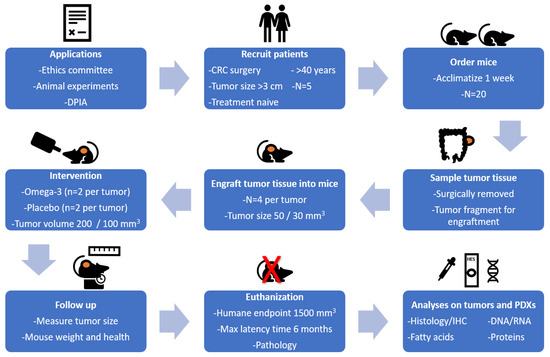 The aim of this study was to establish a preclinical PDX model of CRC in immunodeficient mice and give a thorough presentation of the procedure. In addition, we wanted to evaluate administration of omega-3 FAs enriched in a liquid diet in this model.