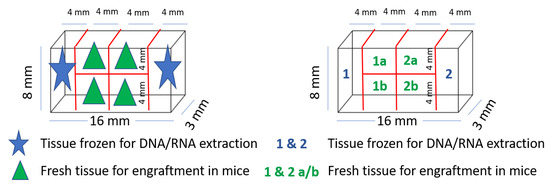 Tumor tissue sampling for: (a) biobanking and (b) PDX procedure.