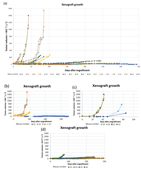 PDX growth curves for: (a) all mice; (b) mouse #12, 15, 16 and 17 (tumor fragments from patient 3); (c) mouse #19, 20, 21 and 22 (tumor fragments from patient 11) and; (d) mouse #23, 24, 25 and 26 (tumor fragments from patient 17).