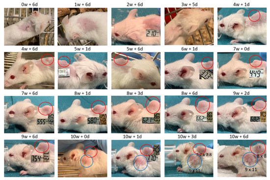 Images of PDX growth (red ring) for mouse #26 (patient 17). Secondary tumor from week 10 (blue ring). Numbers are millimeter (mm) length of the tumor in two dimensions. W = week, d = days.
