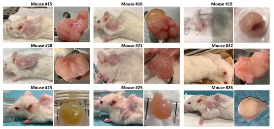 Images of 9 of 10 established PDXs, taken at the day of euthanization. Mouse #17 died during the anesthetic procedure (isoflurane) when assessing tumor size and the tumor was not sampled.