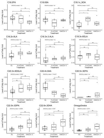 Mouse blood samples were obtained before and after treatment to detect changes in blood FA content during treatment. In mice, the levels of EPA, DHA, and DPA significantly correlated with each other and the Omega-3 index as indicated in Supplementary Figure S5-1. An analysis of variance (ANOVA) on a hierarchical mixed model fitted to each FA and accounting for the measurements before and after treatment in the same mouse model, showed significant effects for oleic acid (OA), digamma linoleic acid (DGLA), arachidonic acid (AA), DPA, DHA, and the Omega-3 index (Figure 16). As expected, the average content of DHA as well as the Omega-3 index were higher in whole blood from the mice receiving fish oil compared to untreated mice (included blood samples from mice before treatment) as shown by a post hoc Tukey test. However, a rise in DHA content was not found in all mice within the fish oil group (mouse #22 and 27). Moreover, we also observed a trend of increased levels of DPA, DHA, and Omega-3 index for mice in the placebo group, although this was not statistically significant. The intake of long chain omega-3 FAs is known to reduce the content of long chain omega-6 FAs since they compete for the same enzymes during FA synthesis (reviewed in [18]). Mice from both treatment groups had reduced AA content in the blood compared to untreated mice; however, the level was lowest in the fish oil group.