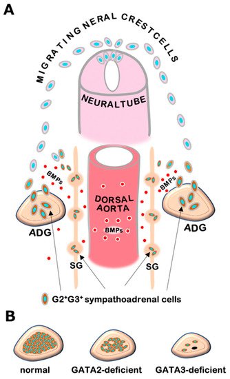 (A) Neural crest cells migrating from the dorsal neural tube undergo differentiation to sympathetic progenitor cells in response to bone morphogenetic proteins (BMPs) secreted from embryonic dorsal aorta. The sympathetic progenitors, which express GATA2 and GATA3, migrate to sympathetic ganglia (SG) and adrenal gland (ADG), and thereafter give rise to sympathetic neuronal cells and adrenal medullary chromaffin cells. (B) GATA3-deficient embryos show a significant decrease in adrenal chromaffin cells (right), while sympathoadrenal cell-specific GATA2-deficient embryos exhibit a modest decrease in chromaffin cells (middle) in comparison with normal adrenal gland in wild-type mice (left).