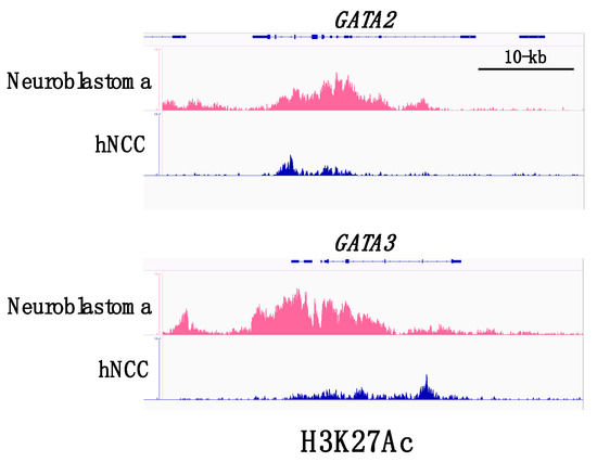 A recent comprehensive analysis delineated the transcriptional regulatory network in a panel of neuroblastoma cell lines and demonstrated that the majority of the neuroblastoma cell lines (18/25) exhibit a noradrenergic identity characterized by enhanced regulatory circuits involving PHOX2A, PHOX2B, HAND2, GATA2, and GATA3 [27]. The gene loci encoding these transcription factors tended to be associated with super-enhancers (Figure 2). Super-enhancers consist of large clusters of enhancers with dense accumulation of enhancer chromatin signatures, including monomethylation of histone H3 at lysine 4 (H3K4me1) and acetylation of histone H3 on lysine 27 (H3K27ac), as well as binding of lineage-specific master transcription factors. Cancer cells often acquire super-enhancers at oncogene loci and induce aberrant expression of the oncogenic factor that determines the cancer cell identity [28]. Since GATA2 and GATA3 are both involved in a complex transcription factor network regulating sympathoadrenergic traits [9,11,24], the frequent occurrence of super-enhancers in GATA2 and GATA3 loci appears to underlie the sympathetic noradrenergic cell identity of neuroblastoma cells. Furthermore, it is conceivable that GATA2 and GATA3 play a fundamental role in the genesis of neuroblastoma, given their roles in normal sympathoadrenal development. Consistent with this hypothesis, GATA3 was reported to be a first-line immunohistochemical marker to facilitate the pathological diagnosis of neuroblastic tumors [29].