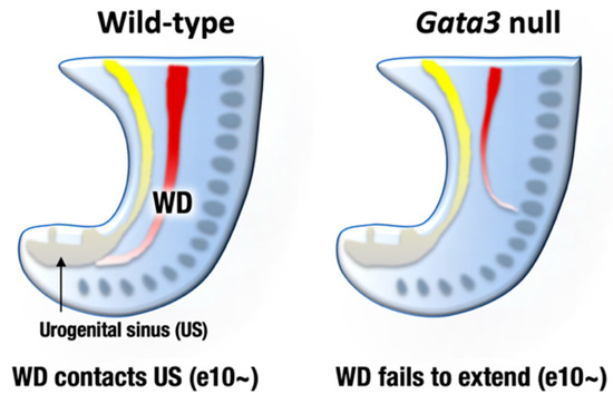 GATA2 and GATA3 are both expressed in the developing mouse urogenital system, while their expression patterns are different. GATA2 is expressed both in the mesenchymal and epithelial tissues of the WDs and UB, whereas GATA3 is specifically expressed in the epithelial cells of the urogenital anlagen [37,38,39]. GATA3 promotes WD extension and insertion into the urogenital sinus (primordium of the bladder and urethra) at e10 and afterwards [38,40,41] (Figure 3, left). Subsequently, GATA3 induces c-Ret expression in the UB and facilitates the GDNF-mediated UB outgrowth and branching morphogenesis of the definitive kidney [42]. Indeed, pharmacologically rescued Gata3-deficient embryos exhibited fatal defects in nephric duct formation. The atretic remnant of the nephric duct sometimes extended in an abnormal direction and terminated within the lateral body wall [38] (Figure 3, right). Consequently, Gata3-deficient mice failed to form the definitive metanephric kidney [9,38]. Additionally, Gata3-deficient female and male late embryos lacked genital organs, i.e., uteri or epididymides/vas deferens [38].