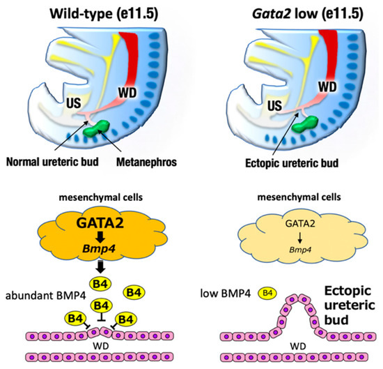 The definitive kidney development begins around e11 when the ureteric bud (UB) sprouts from the posterior WD. Bone morphogenetic protein 4 (BMP4), which is secreted by the urogenital mesenchymal cells surrounding the UB, prevents the aberrant outgrowth of the UB from rostral ectopic sites on the WDs. GATA2-low mice failed to express sufficient level of BMP4. Consequently, the ureteric budding is mislocated in the rostral position of Wolffian duct, which compromise the ureter-bladder connection.