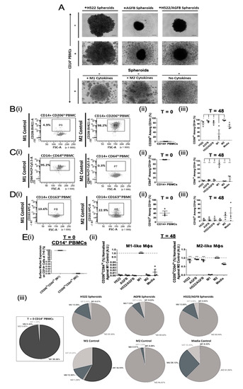 Tumour- and stroma-containing spheroids promote M2-like Mφ polarisation in vitro. H522 cells were cultured alone or together with AG02603 fibroblasts (AGFB) to generate homoTable 48 h formation). Spheroids were co-cultured with healthy donor CD14+ PBMCs for a further 48 h to enable macrophage polarisation. CD14+ cells were polarised into M1 or M2 Mφ controls, as described above, or incubated without cytokines (unpolarised media controls). (A) Morphological assessment of the single- or multi-component spheroid cultures after 48 h polarisation (representative of three independent experiments). Scale bars represents 150 µm. (B–D) (i) Flow cytometry analysis of CD206, CD64, and CD163 expression on CD14+ PBMCs following 48 h polarisation. Summary of (B) CD206, (C) CD64, and (D) CD163 expression on myeloid cells (ii) at T = 0 and (iii) following 48 h spheroid co-culture (matched to T = 0) or cytokine treatment. (E) Summary of the proportion of M1- or M2-like myeloid cells (i) at T = 0 and (ii) 48 h after spheroid co-culture or cytokine treatment (matched to T = 0), determined using two-marker analyses normalised against the respective positive control. E (iii) Pie charts representing the proportion of CD14+ cells exhibiting an M1-, M2-, MU-, and MT-like phenotype following 48 h in vitro culture for all experimental conditions. MT, Transitional myeloid cells; MU, Unpolarised myeloid cells. Each symbol represents an individual patient. The p values were obtained from one-way ANOVA followed by post hoc Tukey test. Statistically significant differences were observed compared to the M2 control ((E) (ii); M1-like Mφs), M1 control ((E) (ii); M2-like Mφs), or all experimental arms (B–D (iii)). Data were obtained from 3 independent experiments using healthy donor blood and graphs show means ± SEM. * p < 0.05, ** p < 0.01, *** p < 0.001.