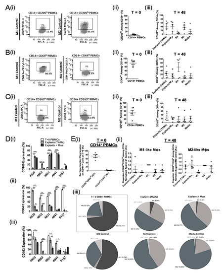 CD64 was highly expressed on myeloid cells at T = 0 (77.6 ± 8.9%; MFI 1170.2 ± 427.2) and was downregulated on cells following 48 h culture with explants, M2 cytokines, or complete medium (7.9–15.9%; MFI −878.7–362.3) (Figure 2B), being highest on M1 controls and lowest on M2 controls. TAMs and explant-conditioned Mφs appeared more M2-like than M1-like based on mean CD64 expression (Figure 2B(iii)).
