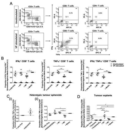 In order to evaluate the immune modifying effects of tumour spheroid- and explant-conditioned macrophages on T cell function, CD14− PBMCs were cultured with autologous tumour-conditioned Mφs, or control Mφs, from either healthy donors or NSCLC patients. Healthy donor or patient CD14+ PBMCs (1 × 104) were co-cultured with heterotypic and homotypic spheroids, or tumour explants (one per well) in adherent 96 well u-bottom plates (Greiner Bio-One, Austria). M1-like, M2-like, and unpolarised media control Mφs were established in parallel. Heterotypic spheroid or explant only (absence of exogenously added CD14+ PBMCs) conditions were established in parallel. After 24–48 h of macrophage polarisation treatment, culture-conditioned medium was removed. Mφ cultures were loaded with a pool of viral/recall peptides (and short immunogenic bacterial peptides; tetanus toxoid, TT) (VP; 5 μg/mL) derived from antigens of Influenza A, human Cytomegalovirus (HCMV), and Epstein-Barr virus (EBV) (Severn Biotech Ltd.; Kidderminster, United Kingdom), with a wide variety of HLA (MHC-I and MHC-II) restrictions (epitope sequences shown in Table S2) for 1 h. DMSO (Sigma-Aldrich; Missouri, United States), diluted the same as for the peptides, was added as a control. Cryopreserved autologous CD14− PBMCs were thawed and added (1 × 105 cells/ well) in fresh complete medium to tumour-conditioned cultures. T cells only controls were established in parallel. T cell cultures were supplemented with 20 ng/mL IL-1β (Peprotech; New Jersey, United States) and 1000 U/mL IFNα (R&D Systems; Minnesota, United States), and cultured for 6 days [26,27]. Supernatants were collected, centrifuged (354× g for 5 min; Heraeus Megafuge 1.0, Thermo Fisher Scientific, Massachusetts, United States) to remove cell debris, and frozen at −20 °C until required for LEGENDplexTM (BioLegend; California, United States) analysis. T cell cultures were then re-stimulated with 5 μg/mL VP pool in fresh complete medium for 1 h at 37 °C before 1 μL/mL Golgi Plug (BD PharMingen; San Diego, CA, United States) and 0.7 μL/mL Golgi Stop (BD PharMingen; California, United States) were added, followed by 13 h further incubation at 37 °C. Cells were harvested, washed in PBS, and stained with Fixable Viability Dye eFluor780 (eBioscience; California, United States) as described above. Cells were fixed for 15 min at RT in Fixation Buffer (eBioscience; California, United States), washed, and permeabilised using 1× Permeabilisation Buffer (eBioscience; California, United States) containing 2.5% mouse serum (RT; Sigma-Aldrich; St. Louis, MO, United States). After 15 min, cells were stained with PE/Cy7-CD3 (eBioscience; California, United States), BV421-CD4 (BioLegend; California, United States), PerCP/Cy5.5-CD8 (eBioscience; California, United States), FITC-IFNγ (eBioscience; California, United States), and APC-TNFα (eBioscience; California, United States) Staining was performed at RT for 40 min in the dark. Pro-inflammatory cytokine production from T cells was measured by flow cytometry. Viable T cells were gated based on positive CD3 staining and negative Fixable Viability Dye eFluor780 staining.