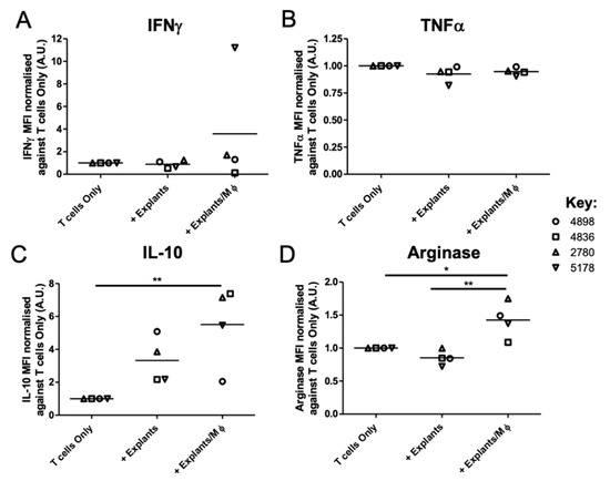 In contrast, the levels of the anti-inflammatory molecules, IL-10 (+ Explants: 495.4 ± 37.4 MFI; + Explants/Mφ: 1036.2 ± 337.3 MFI) and arginase (+ Explants: 32306.1 ± 2235.2 MFI; + Explants/Mφ: 53625.3 ± 3946.0 MFI) produced from T cell cultures was significantly increased in the presence of explant-conditioned Mφs, but not explants alone (Figure 5C,D). The concentration of IL-10 detected in explant-conditioned T cell culture supernatants ranged from 2.7–4.0 pg/mL and 1.7–17.0 pg/mL in the absence and presence of exogenously added myeloid cells, respectively (Table 2). Similarly, arginase concentrations ranged from 2346.5–3286.0 pg/mL and 4213.0–5712.6 pg/mL in the absence and presence of exogenously added myeloid cells, respectively (Table 2). No other Th2-related factors were notably changed following the addition of exogenous Mφs to explant-conditioned T cell co-cultures (Table S3).