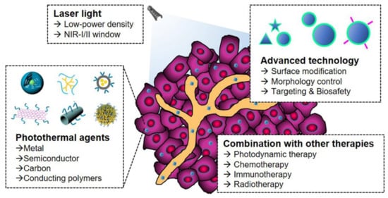 Many innovative strategies have been developed to improve the practicality of the PTT approach for anticancer therapy. The strategies include: (i) the identification of appropriate irradiation conditions, such as power density and time [,]; (ii) monitoring and optimization of the accumulation of NPA in tumor tissue []; (iii) improvement in PCE or targeting ability of NPA by controlling morphological properties or functionalization via surface engineering []; and (iv) development of NPAs with absorption in the near-infrared (NIR) II region (1000–1700 nm) [,] (Figure 1). PTT was also combined with different therapeutic methods, such as photodynamic therapy (PDT), immunotherapy, chemotherapy, or radiotherapy, to exploit each therapy’s advantages, and offset their limitations. Combined PTT treatment with other therapies has shown significant treatment outcomes by improving drug delivery efficiency, triggering drug release, controlling the tumor microenvironment (TME), or eliciting tumor-specific antigen release [].