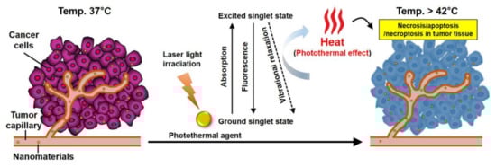 In terms of the mechanism of action, photothermal agents act as an enhancer to heat up target cells or tissues. Specifically, on irradiation by light of a specific wavelength, the agents absorb energy, and are excited from the ground singlet state to an excited singlet state. The excited PTT agent then undergoes nonradiative vibrational relaxation, returning to the ground state by a collision between the excited photothermal agents and the surrounding molecules. As a result, the increased kinetic energy heats the surrounding tumor microenvironment (Figure 3).