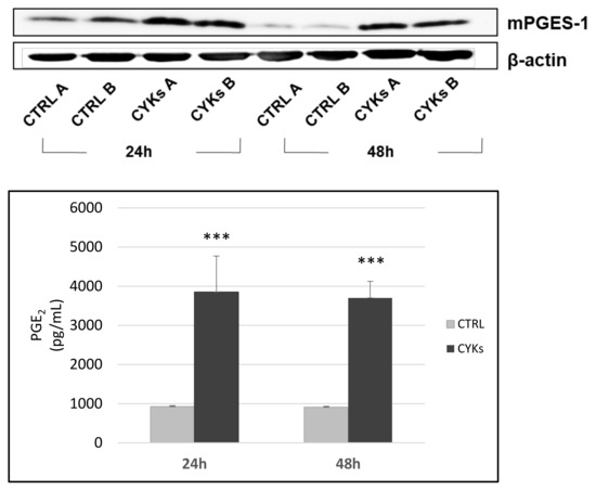 Development of an inflammation model on normal human dermal fibroblast (NHDF) cells. Fibroblasts were treated with IL-1β (10 ng/mL) + TNF-α (10 ng/mL) for 24 h and 48 h. Whole cell lysates were collected to assess mPGES-1 expression by Western blot (upper panel). Samples A and B represent intra-experimental duplicates. The measurement of PGE-2 performed by immunoenzymatic assay is reported (lower panel). At both times, there is an upregulation of the prostanoid system. Data represent means +/− SD (n = 3) *** p < 0.001 CYKs group vs. CTRL group.