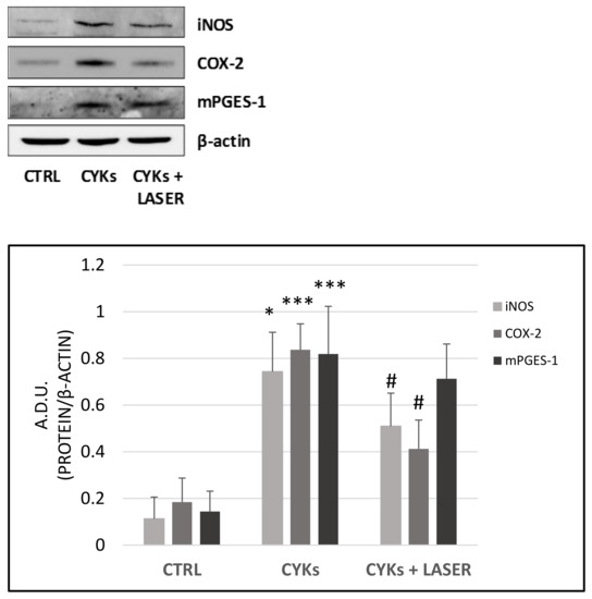 Effect of laser treatment on NDHF cells stimulated with pro-inflammatory cytokines. Fibroblasts were treated with IL-1β and TNF-α, each at 10 ng/mL for 48 h, then culture medium was replaced by fresh culture medium and samples divided into 3 groups: CYKs + Laser—samples stimulated with cytokine mix and then exposed to laser treatments (3 treatments, repeated once a day, for 3 consecutive days); CYKs—samples stimulated with cytokine mix and not exposed to laser treatment; CTRL—samples not stimulated and not exposed to laser treatment. Six hours after the third laser treatment, whole cell lysates of all samples were collected, and Western blot was performed to assess protein abundance of iNOS, COX-2, and mPGES-1 (upper panel). Immunoblots were analyzed by densitometry and the results, expressed as arbitrary density units (A.D.U.), were normalized to β-Actin (lower panel). Data represent means +/− SD (n = 2) * p < 0.05 and *** p < 0.001 CYKs group vs. CTRL group, # p <0.05 CYKs + Laser group vs. CYKs group.
