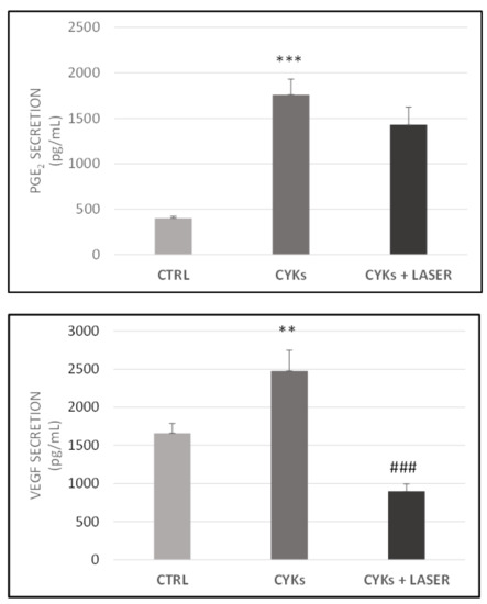 Modulation of PGE-2 and vascular endothelial growth factor (VEGF) release in NHDF cells exposed to pro-inflammatory cytokines and laser treatment. Fibroblasts were treated with IL-1β and TNF-α, each at 10 ng/mL for 48 h, then the culture medium was replaced by fresh culture medium and samples divided into 3 groups: CYKs + Laser—samples stimulated with cytokine mix and then exposed to laser treatments (3 treatments, repeated once a day, for 3 consecutive days); CYKs—samples stimulated with cytokine mix and not exposed to laser treatment; CTRL—samples not stimulated and not exposed to laser treatment. Six hours after the third laser treatment, all samples were recovered, and PGE-2 (upper panel) and VEGF (lower panel) levels were evaluated in conditioned media using specific ELISA kits. Dosing of each condition was performed in double, and quantification is expressed as pg/mL. Data represent means +/− SD (n = 2) ** p < 0.01 and *** p < 0.001 CYKs group vs. CTRL group, ### p < 0.001 CYKs + Laser group vs. CYKs group.