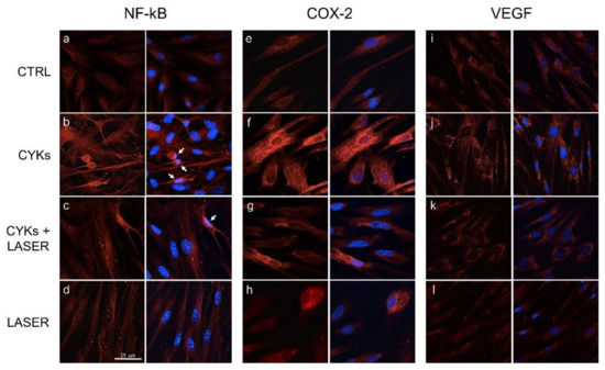 Laser treatment reduces inflammatory response in NHDF cells by limiting NF-κB translocation into the nucleus and down-regulating COX-2 and VEGF expression. Confocal analysis of NF-κB (panels (a–d)), COX-2 (panels (e–h)) and VEGF (panels (i–l)) expression and localization (magnification 63×) evaluated by immunofluorescence on NHDF in basal conditions (CTRL; panels (a,e,i)), stimulated with IL-1β and TNF-α for 48 h (CYKs; panels (b,f,j)), stimulated with IL-1β and TNF-α for 48 h, and then exposed to laser treatments (3 treatments, repeated once a day, for 3 consecutive days) (CYKs + LASER; panels (c,g,k)) and exposed to laser alone (LASER; panels (d,h,l)). For each series, the left panels show the protein of interest in red, while DAPI staining (blue) was merged on the right panels. White arrows indicate cells with nuclear localization of NF-kB. Bar = 25 µm.