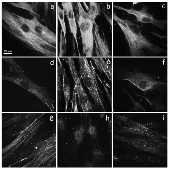 As regards actin distribution and organization, control fibroblasts showed a perinuclear area rich of G-actin, a network of very thin microfilaments distributed in the cell cytoplasm, and a thin actin layer placed close to the plasma membrane (Figure 5d). In the stimulated fibroblasts, F-actin was predominant, with microfilaments arranged in parallel and thicker in comparison with those observed in control cells (Figure 5e). As already noted for tubulin, also in the case of actin, the stimulated cell samples which were then exposed to laser radiation recovered a condition similar to the control cells, with G-actin thickened in the perinuclear area, few very thin microfilaments and a thin actin layer close to the cell membrane (Figure 5f).