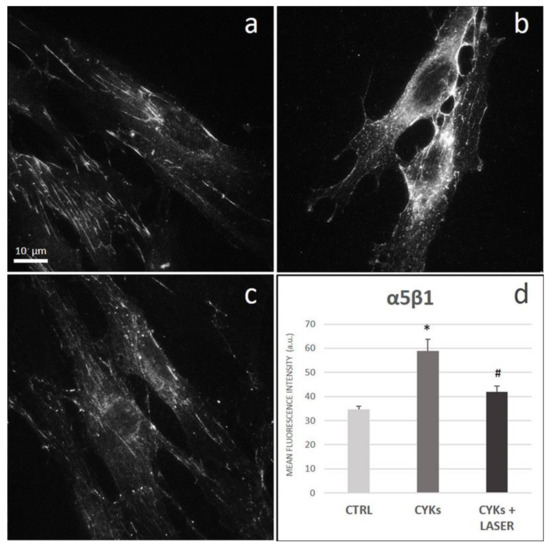 Effect of laser treatment on α5β1 expression and distribution. Microscopy analysis of α5β1 expression evaluated by immunofluorescence (magnification 100×) on NHDF in basal conditions (CTRL; panel (a)), stimulated with IL-1β and TNF-α for 48 h (CYKs; panel (b)), stimulated with IL-1β and TNF-α for 48 h and then exposed to laser treatments (3 treatments, repeated once a day, for 3 consecutive days) (CYKs + Laser; panel (c)). Bar = 10 µm. The histogram reports the mean pixel intensity, acquired by ImageJ software after appropriate thresholding and subsequent image masking (panel (d)). * p < 0.05 CYKs group vs. CTRL group; # p < 0.05 CYKs + Laser group vs. CYKs group (n = 3).