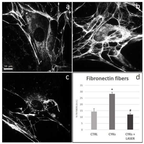 Effect of laser treatment on fibronectin expression and organization. Microscopy analysis of fibronectin expression evaluated by immunofluorescence (magnification 100×) on NHDF in basal conditions (CTRL; panel (a)), stimulated with IL-1β and TNF-α for 48 h (CYKs; panel (b)), stimulated with IL-1β and TNF-α for 48 h and then exposed to laser treatments (3 treatments, repeated once a day, for 3 consecutive days) (CYKs + Laser; panel (c)). Bar = 10 µm. The histogram reports the % of the surface area with fibers, acquired by ImageJ software after appropriate thresholding to only include the stained fibers (panel (d)). * p < 0.05 CYKs group vs. CTRL group; # p < 0.05 CYKs + Laser group vs. CYKs group (n = 3).