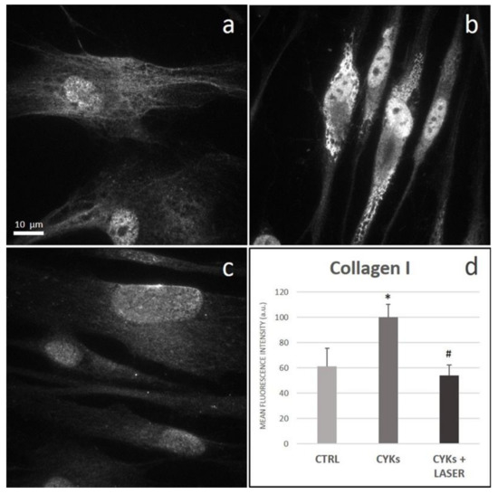 Effect of laser treatment on Collagen I expression and distribution. Microscopy analysis of Collagen I expression evaluated by immunofluorescence (magnification 100×) on NHDF in basal conditions (CTRL; panel (a)), stimulated with IL-1β and TNF-α for 48 h (CYKs; panel (b)), stimulated with IL-1β and TNF-α for 48 h and then exposed to laser treatments (3 treatments, repeated once a day, for 3 consecutive days) (CYKs + Laser; panel (c)). Bar = 10 µm. The histogram reports the mean pixel intensity, acquired by ImageJ software after appropriate thresholding and subsequent image masking (panel (d)). * p < 0.05 CYKs group vs. CTRL group; # p < 0.05 CYKs + Laser group vs. CYKs group (n = 3).