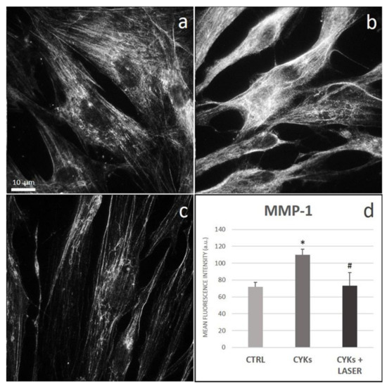 Effect of laser treatment on MMP-1 expression and distribution. Microscopy analysis of MMP-1 expression evaluated by immunofluorescence (magnification 100×) on NHDF in basal conditions (CTRL; panel (a)), stimulated with IL-1β and TNF-α for 48 h (CYKs; panel (b)), stimulated with IL-1β and TNF-α for 48 h and then exposed to laser treatments (3 treatments, repeated once a day, for 3 consecutive days) (CYKs + Laser; panel (c)). Bar = 10 µm. The histogram reports the mean pixel intensity, acquired by ImageJ software after appropriate thresholding and subsequent image masking (panel (d)). * p < 0.05 CYKs group vs. CTRL group; # p < 0.05 CYKs + Laser group vs. CYKs group (n = 3).