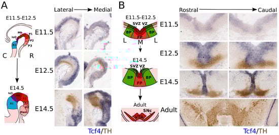 Tcf4 is expressed in the VZ of the developing midbrain and overlaps with part of the rostral TH-expressing population. (A) Sagittal view of Tcf4 expression throughout development. Tcf4 (blue) is expressed from E11.5 onward in the developing embryonic midbrain area. At E11.5, expression of Tcf 4. is specific for the VZ from R1–P3. At E12.5, its expression overlaps with the medial part of the TH-expressing neuronal population (brown), which is more apparent at E14.5 and even strongly overlaps with the rostral TH+ population. Anatomic maps were adapted from the Allen Brain Atlas (http://atlas.brain-map.org accessed on 3 January 2019). C: caudal, R: rostral. (B) Coronal view of Tcf4 expression throughout development and in the adult. Tcf4 (blue) shows expression in the VZ of the BP of the midbrain at E11.5. Expression in the FP is not clearly detected until E12.5. Overlap with the TH-expressing population (brown) can mainly be detected in medial parts of the midbrain at E12.5 and E14.5. In the adult midbrain, Tcf4 is no longer detected. Anatomic maps were adapted from the Allen Brain Atlas (http://atlas.brain-map.org accessed on 3 January 2019). L: lateral, M: medial.