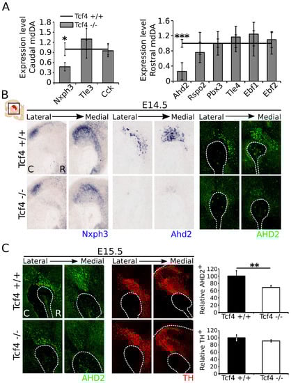 To determine whether Tcf4 may have a role in subset development of the mdDA neuronal population, we examined the expression levels of several rostral and caudal subset markers in E14.5 dissected midbrain material by means of qPCR (Figure 3A). Expression of the caudal markers Tle3 and Cck [8] was unaffected in the mdDA neuronal population, whereas the caudal marker Nxph3 [35] showed a decrease of ~50% in the Tcf4 mutant midbrain (n = 4; p = 0.036, two-tailed). Expression of the rostral markers Rspo2, Pbx3, Tle4, Ebf1, and Ebf2 were unaffected in the Tcf4 mutant midbrain (n = 4) [8,36]. Expression of Rspo2 appeared to be downregulated with ~25%, but due to large variation between embryos, this was not significant (n = 4; p = 0.35, two-tailed). Ahd2 expression, on the other hand, showed a downregulation of ~75% in the Tcf4 mutant (n = 4; p = 0.0008, two-tailed). The loss of Nxph3 in caudal areas and Ahd2 in rostral areas was confirmed via in situ hybridization at E14.5 (Figure 3B). Similar to Ahd2 transcript expression, AHD2 protein levels were strongly affected at E14.5 (Figure 3B).