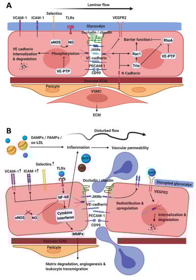 The endothelium under (patho)physiologic conditions. (A) Tight junctions, made by occludins, claudins, and JAMs, together with adherens junctions, formed by VE-cadherin, PECAM-1 and CD99 control endothelial barrier function by maintaining interendothelial junctions. Endothelial cells are connected to the vascular ECM, pericytes and VSMCs via N-cadherin and other interactions. N-cadherin activates Trio, Rac1 and also directly induces assembly of VE-cadherin junctions. Trio, as well as VE-PTP, inhibits RhoA. Additionally, VE-PTP prevents phosphorylation and subsequently degradation of VE-cadherin. NO is formed aiming to maintain a laminar flow together with the functional and intact glycocalyx. (B) Endothelial cells can become activated by disturbed flow and inflammatory mediators. VEGF activates VEGFR2 leading to internalization and degradation of VE-cadherin and TLR-activation results in NF-κB-activation. This mediates upregulation of adhesion molecules and cytokine/interferon production. This ultimately leads to leukocyte transmigration, vascular permeability, matrix degradation and angiogenesis. AJs—adherens junctions; DAMPs—damage associated molecular patterns; ECs—endothelial cells; ECM—extracellular matrix; eNOS—endothelial nitric oxide; ICAM-1—intracellular adhesion molecule-1; JAMs—junctional adhesion molecules; MMPs—matrix metallo proteinases; NO—nitric oxide; ox-LDL—oxidized low-density lipoproteins; PAMPs—pathogen-associated molecular patterns; PECAM-1—platelet endothelial cell adhesion molecule-1; TJs—tight junctions; TLR—Toll-like receptor; VCAM-1—vascular adhesion molecule-1; VE-cadherin—vascular endothelial-cadherin; VEGF—vascular endothelial growth factor; VEGFR2—VEGF receptor 2; VE-PTP—vascular endothelial protein tyrosine phosphatase; VSMCs—vascular smooth muscle cells.