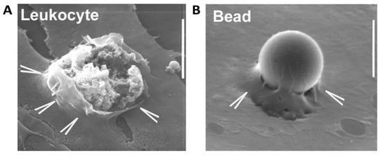 Leukocyte and static bead transmigration. Protrusive membranes (Endothelial protrusions, indicated by the arrowheads) arise from the apical endothelial surface and surround a leukocyte (A) or a static bead (B). The protrusions are believed to assist the leukocyte on its way through and limit vascular leakage. The image on the left may represent a transcellular event with the leukocyte on its way through the endothelial cell border, although the openings at the endothelial level may also suggest that this is a paracellular event. Scale bar: 10 μm.