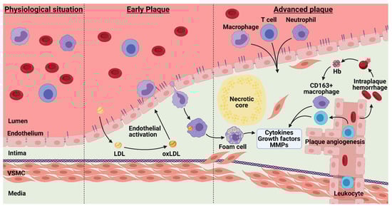 Pathophysiology of early and advanced atherosclerosis. Upon transcytosis and oxidation of LDL, the endothelium becomes activated leading to leukocyte infiltration into the vessel wall. This triggers thickening of the intimal layer, ultimately resulting in foam cell accumulation and necrotic core formation. Hypoxia induces intra-plaque angiogenesis, but these neovessels are often mature which leads to intraplaque hemorrhage and excessive extravasation of leukocytes. This results in production of cytokines, growth factors and MMPs, creating a continuous loop of plaque growth and ultimately plaque rupture. Hb—hemoglobin; LDL—low-density lipoproteins; MMPs—metallo matrix proteinases; oxLDL—oxidized low-density lipoproteins; VSMC—vascular smooth muscle cell.