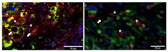 Inflammatory cell association with plaque neovessels. Inflammatory cells (indicated by stars) located near neovessels (indicated by arrows) in murine atherosclerotic vein grafts (A) Hemoglobin associated CD163+ macrophages localizing near neovessels, DAPI (blue), CD31 (green), and CD163 (red) (B) CD3+ T cells localizing near neovessels, DAPI (blue), CD31 (green) and CD3 (red).