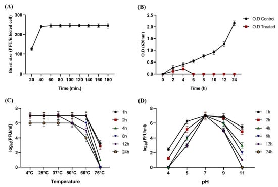 The known KPP-5 phage titer (7 log10) was subjected to different temperatures (4 °C, 25 °C, 37 °C, 50 °C, 60 °C, and 75 °C) to determine its thermostability according to Philipson et al. [35]. Similarly, the same KPP-5 phage was incubated at various pH values (4, 5, 7, 9, and 11) in order to know its stability, as previously reported [36]. For the stability assessment, the KPP-5 phage titer was determined at 1, 2, 4, 8, 12, and 24 h using the above-mentioned agar overlay method [27].