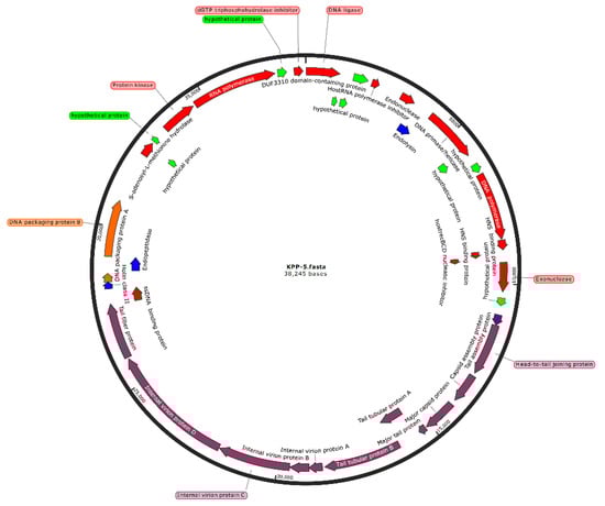 In general, a bioinformatics analysis can predict both the biological properties and the safety of phage to be used for medical purposes. As a result, the complete KPP-5 phage genome was sequenced and analyzed using various bioinformatics tools. The KPP-5 phage has a linear dsDNA genome of 38,245 bp in length with a GC content of 50.8%. The genome contains 40 predicted open reading frames (ORFs), with the primary starting codon for all ORFs being ATG, all of which have been shown to be located on the KPP-5 phage genome′s positive strand (Figure 3). Of the 40 ORFs predicted, only 31 are identical to the actual functional genes that have been shown to encode proteins, while the remaining nine ORFs were predicted to encode hypothetical proteins with no assigned function. No tRNA genes have been identified in the KPP-5 phage genome. The characteristics of the KPP-5 phage gene products, including ORF positions, predicted products (aa), and homologs with predicted protein motifs, are shown in Table S2. The total annotated ORFs can be further categorized into five modules (Table S3): (i) replication, regulation, transcription, and translation (14 ORFs); (ii) host cell lysis (3 ORFs); (iii) phage structure (12 ORFs); (iv) DNA packaging (2 ORFs); and (v) unknown functions (9 ORFs). Interestingly, phage-borne virulence genes or drug resistance genes were not present, suggesting that KPP-5 could be safely used as a phage biocontrol agent where phage genomes used for therapy should be absolutely safe [69].