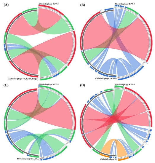 Circos plot depicting sequence similarities of Klebsiella phage Kpp-5 against Klebsiella phage vB_KpnP_Emp27 (A), Klebsiella phage Patroon (B), Klebsiella phage NL_ZS_3 (C), and Klebsiella phage 31 (D). The red color signifies a high sequence similarity followed by orange, green, and blue. Ratio coloring with blue ≤ 0.25, green ≤ 0.50, orange ≤ 0.75, and red > 0.75.