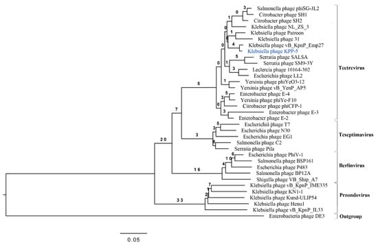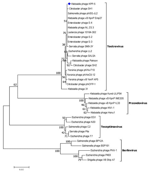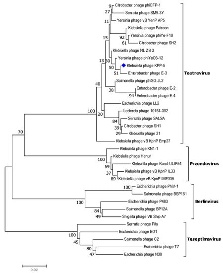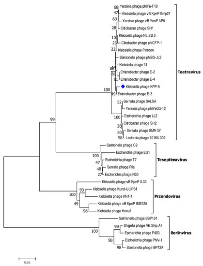 Six structural protein-encoding genes have also been annotated, including capsid assembly protein (gp19, GenBank No. QSJ04738), major capsid protein (gp20, GenBank No. QSJ04740), internal virion protein A (gp24, GenBank No. QSJ04744), internal virion protein B (gp25, GenBank No. QSJ04745), internal virion protein C (gp26, GenBank No. QSJ04746), and internal virion protein D (gp27, GenBank No. QSJ04747), among the 12 actual phage structure genes of phage KPP-5 (Table S3). KPP-5 phage, a major capsid protein, showed high similarity to Klebsiella phage NL_ZS_3 (99.71% identity and 100% query coverage, GenBank No. QNN97371) compared to this in Klebsiella phage Patroon (97.99% identity and 100% query coverage, GenBank No. QBQ72901), Klebsiella phage vB_KpnP_Emp27 (97.38% identity and 99% query coverage, GenBank No. QEG11891), and Klebsiella phage 31 (97.38% identity and 98% query coverage, GenBank No. QGH73746) (Table S5). The major capsid protein is relatively conserved and is often used to classify phages [87,88,89,90]. Therefore, on the basis of the alignment of major capsid protein amino acid sequences, there were phylogenetic relationship between Klebsiella phage KPP-5 and the same phages used in the entire genome phylogeny (Table S4). A major capsid protein phylogenetic analysis showed that KPP-5 is most closely related to the Teetrevirus genus in the Autographviridae family (Figure 8).