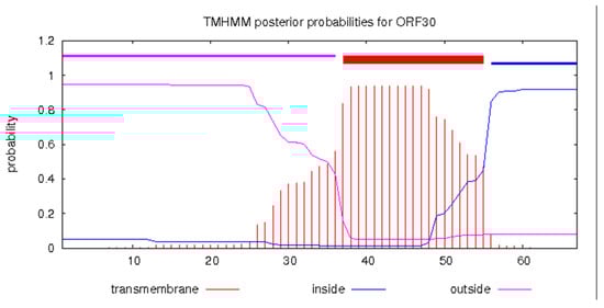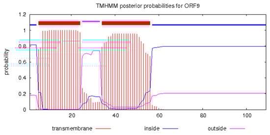 Predicted hypothetical protein (gp09, GenBank No. QSJ04729) transmembrane structure using the TMHMM prediction server. Red blocks are predicted transmembrane domains on the top line, while the abscissa represents the sequence position, and the ordinate represents the prediction probability.