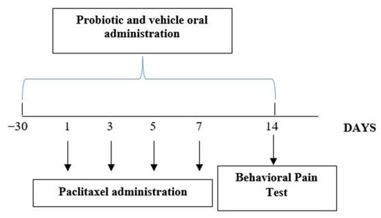 PTX (Tocris, Bristol, UK) was dissolved in a solution made up of 50% Cremophor EL and 50% absolute ethanol and stored at −20 °C, for a maximum of 14 days, and then diluted in normal saline (NaCl 0.9%) to obtain a final concentration of 8 mg/mL just before administration. SLAB51 formulation was provided by Ormendes SA (Switzerland). SLAB51 was freshly prepared by dissolving one sachet (1.5 g/200 billion of bacteria) in 10 mL of drinking water as previously described [39]. SLAB51 and vehicle were given orally for 44 days (as shown in Figure 1) dissolved daily in drinking water.2.4. Chemotherapy-Induced Peripheral Neuropathy