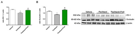 Western blotting analyses for ZO-1 (A) and occludin (B) in the distal colon. *, p < 0.05; vs. vehicle; #, p < 0.05 vs. paclitaxel (n = 3). A representative figure for each protein is shown.