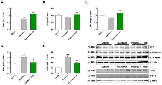 Western blotting analyses for CB1 (A), µ (B) and kappa (C) receptors, iNOS (D), and Cox-2 (E) proteins in spinal cords. ***, p < 0.0001; **, p < 0.005; #, *, p < 0.05 vs. vehicle; ###, p < 0.0001, ##, p < 0.005; #, p < 0.05 vs. paclitaxel (n = 3). A representative figure for each protein is shown. Western blotting analyses for CB1, µ and kappa receptors, iNOS, and Cox-2 proteins in spinal cords. ***, p < 0.0001; **, p < 0.005; vs. vehicle; ##, p < 0.005; #, p < 0.05 vs. paclitaxel (n = 3). A representative figure for each protein is shown.