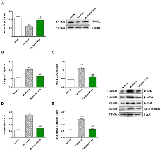 Western blotting analyses for PPARγ (A), p-STAT3 (B), p-JAK2 (C), p-FAK (D), acetyl α-tubulin (E) in spinal cords. ***, p < 0.0001; **, p < 0.005; vs. vehicle; ###, p < 0.0005; ##, p < 0.005; #, p < 0.05 vs. paclitaxel (n = 3). A representative figure for each protein is shown.