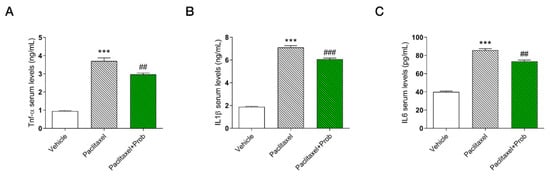 Based on these results, we also evaluated the systemic anti-inflammatory effect of probiotic analyzing pro-inflammatory TNF-α and IL1β and IL6 concentrations in serum. Results clearly showed a significant increase of all pro-inflammatory mediators in the paclitaxel group with respect to the vehicle group (Figure 6A–C, *** p < 0.0001 vs. vehicle). Probiotic treatment counteracted this effect; in fact, all pro-inflammatory mediators analyzed, Tnf-α and IL1β and IL6, were significantly decreased (Figure 6A–C, ##, p < 0.005; ###, p < 0.0001; ##, p < 0.005 vs. paclitaxel respectively). These results confirmed the probiotic formulation’s anti-inflammatory effects as already observed in the analyses of PPARγ protein levels.