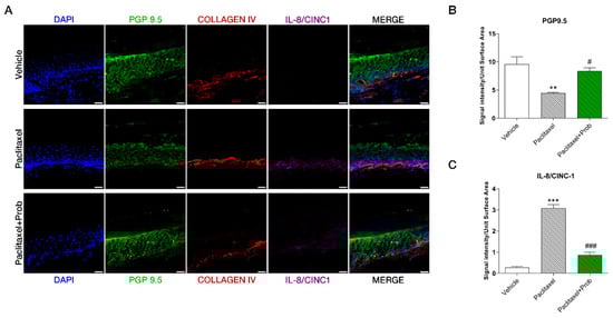 (A) Immunofluorescence analyses at confocal microscopy for PGP 9.5 (green), collagen IV (red), IL-8/CINC1 (purple), DAPI (blue) in the paw, scale bar: 25 µm. A representative figure for each marker is shown. Signal intensity analyses for PGP 9.5 (B) and IL8 (C). **, p < 0.005; ***, p < 0.0001; vs. vehicle; ###, p < 0.0001; #, p < 0.05 vs. paclitaxel (n = 3).