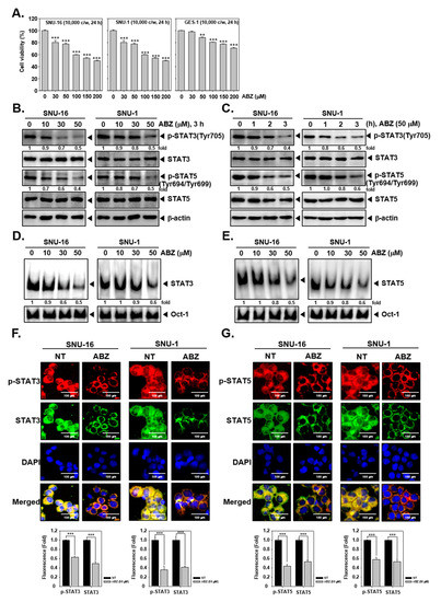 Yang, M.H.; Ha, I.J.; Um, J.-Y.; Ahn, K.S. Albendazole Exhibits Anti-Neoplastic Actions against Gastric Cancer Cells by Affecting STAT3 and STAT5 Activation by Pleiotropic Mechanism(s). Biomedicines 2021, 9, 362. https://doi.org/10.3390/biomedicines9040362