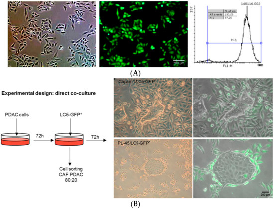 Photographs of phase contrast and fluorescence microscopy of the selection of fibroblast LC5-GFP+ after FACS sorting. The percentage of GFP expressing fibroblasts was higher than 97% (A). Strategy scheme of direct cocultures: representative images at 72 h of pancreatic tumor cells (Capan-1 or PL-45) and fibroblast LC5-GFP+ (B). Green cells are GFP-transfected fibroblasts.