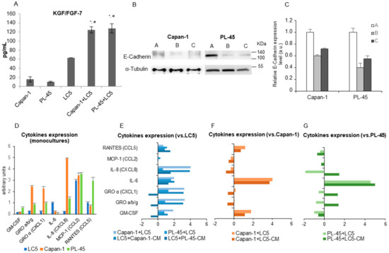 Changes in protein expression and cytokine secretion in coculture models. KGF/FGF-7 concentration from supernatants of monoculture and fibroblasts-pancreatic tumor cells cocultures. FGF-7 concentration in cocultures was significantly higher than that in monocultures (*—LC5, #—corresponding tumor cell line; p < 0.0001). Data represent mean ± SD of three independent assays (A). Expression of epithelial mesenchymal transition (EMT) marker E-cadherin in pancreatic tumor cells by immunoblotting is shown. Loading control—α-Tubulin (B). Representative quantification of E-cadherin expression from Western blot is shown. A: cells grown alone at monoculture. B: cells grown at cocultures with fibroblasts (protein extracts obtained after sorting), and C: cells grown with CM from fibroblast (C). Quantification of secretome dot blots from LC5, Capan-1 and PL-45 cells growing as monocultures according to AAH-CYT-1 human cytokine antibody array is shown—represents the molecules most significantly expressed (D). Relative differences are shown by cytokine expression levels compared to LC5 monoculture (E), compared to Capan-1 monoculture (F), and compared to PL-45 monoculture (G). X-axis values shown are log2 of the normalized levels.