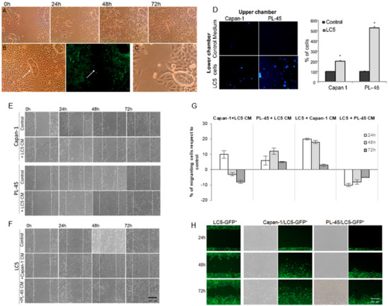To explore whether cell–cell contact is necessary for migration activity, we cultured Capan-1 or PL-45 tumor cells with fibroblast CM for 3 days (Figure 4E), and vice versa—LC5 was cultured with CM from each tumor cell line (Figure 4F) and their migration activity was assayed to assess wound-healing. Only PL-45 cells exposed to LC5 supernatant showed a weak migration increase at 48 h (Figure 4E).