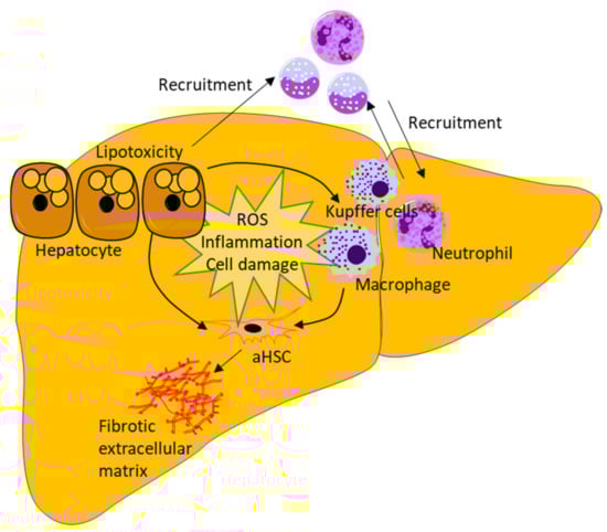 The excess lipid and cholesterol accumulation in hepatocytes can cause lipotoxicity by generating free radicals, such as reactive oxygen species (ROS), thereby promoting oxidative stress, compromising cellular metabolism and membrane integrity, and leading to decreased organelle function (e.g., mitochondrial dysfunction and endoplasmic reticulum (ER) stress) and the release of pro-inflammatory cytokines [2]. Hepatic cholesterol accumulation can activate HSCs directly by stimulating toll-like receptor 4 signaling or indirectly through an uptake of Kupffer cells that subsequently activate HSCs by secreting interleukin IL-1β, tumor necrosis factor (TNF), and TGFβ [40,41] (Figure 3).