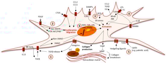 Molecular mechanisms of hepatic stellate cell activation. The activation of hepatic stellate cells involves multiple signaling pathways and receptor systems. 1: TGFβ is one of the most potent fibrogenic factors and is released in response to insults. In HSCs, TGFβ is released through IL-13-dependent induction and via integrin-mediated interactions with extracellular TGFβ stored in a LLC. TGFβ acts through SMAD and non-SMAD pathways to increase collagen synthesis and extracellular matrix deposition. An increased TIMP level inhibits MMP expression and collagen breakdown. 2: PDGF induces RAS-MAPK and PI3K-AKT/PKB signaling that—alongside cytokines and growth factors such as CCL2, CCL5, and CTGF—promotes HSC proliferation and migration. 3: Increased ROS induce ER stress, which (alongside DAMPs) leads to HSC activation. 4: Gut permeability may increase in NASH, and gut-derived and hepatic FC signaling through TLR4 promotes the production of inflammatory cytokines, growth factors, and HSC activation. In addition, TLR4 signaling can indirectly activate HSCs by decreasing the expression of the TGFβ decoy receptor BAMBI, which is also decreased by the inflammatory cytokine IL-1β. 5: In turn, lipotoxic lipid (e.g., palmitic acid) signaling through TLR2 and Hedgehog-derived signaling further contributes to HSC activation. 6: Nuclear receptors also play an important role in HSC activation, being inhibited by RXR, FXR, LXR, PXR, and PPARγ (decreased in activated HSCs). Though all mechanisms of HSC activation remain to be disclosed, this figure illustrates the highly complex cellular signaling patterns involved in NASH-associated HSC activation and the subsequent production of a fibrous extracellular matrix. AKT/PKB: protein kinase B. CTGF: connective tissue growth factor. BAMBI: bone morphogenetic protein and activin membrane-bound inhibitor. CCL: chemokine C-C motif ligand. DAMP: damage-associated molecular patterns. ER: endoplasmic reticulum. FC: free cholesterol. FXR: farnesoid X receptor. HSC: hepatic stellate cell. IL: interleukin. LPS: lipopolysaccharide. LAP: latency-associated protein. LLC: large latent complex. LTBP: latent TGF-β-binding protein. LXR: liver X receptor. MAPK: mitogen-activated protein kinase. MMP: matrix metalloproteinase. NAFLD: non-alcoholic fatty liver disease. PDGF: platelet-derived growth factor. PI3K: phosphoinositide 3-kinase. PPARγ: peroxisome proliferator-activated receptor γ. PXR: pregnane X receptor. ROS: reactive oxygen species. RXR: retinoid X receptor. TIMP: tissue inhibitor of matrix metalloproteinase. TGFβ: tissue growth factor β. TLR: toll-like receptor. SMAD: mothers against decapentaplegic homolog. Arrow heads indicate activation, and transversal lines indicate inhibition.