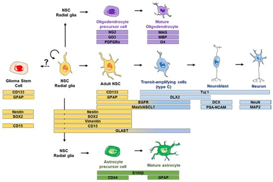 Markers of glioma stem cells, neural stem cells and their progeny. GFAP: glial fibrillary acidic protein; CD133: prominin 1; SOX2: sex determining region Y-box 2; NG2: neuron-glial antigen 2; GD3: GD3 ganglioside; PDGFRa: platelet derived growth factor receptor alpha; MAG: myelin associated glycoprotein; MBP: myelin basic protein; O4: surface antigen O4; GLAST: astrocytic glutamate transporter; EGFR: epidermal growth factor receptor; ASCL1: Achaete-scute complex homolog-1 (ASCL1), known as MASH1 in rodents; Tuj1: neuron-specific class III beta-tubulin; DLX2: distal-less homeobox 2; DCX: doublecortin; PSA-NCAM: polysyalated-neural cell adhesion molecule; NeuN: hexaribonucleotide binding protein-3; MAP2: microtubule associated protein 2.