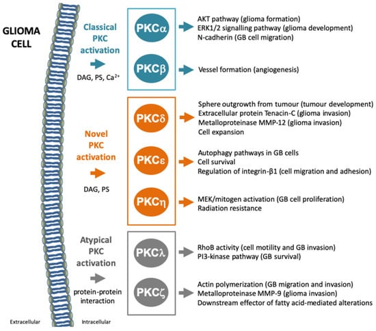 In contrast to the usual actions of PKCs in different cancer cell types, their role in the development of GBM seems to be different depending on the isozyme [118]. Below, we analyze the different PKC isozymes to understand their implication in the development of GBM and their potential as targets for GBM treatments. Figure 3 contains a summary of the activities of different PKC isozymes in GBM physiology.
